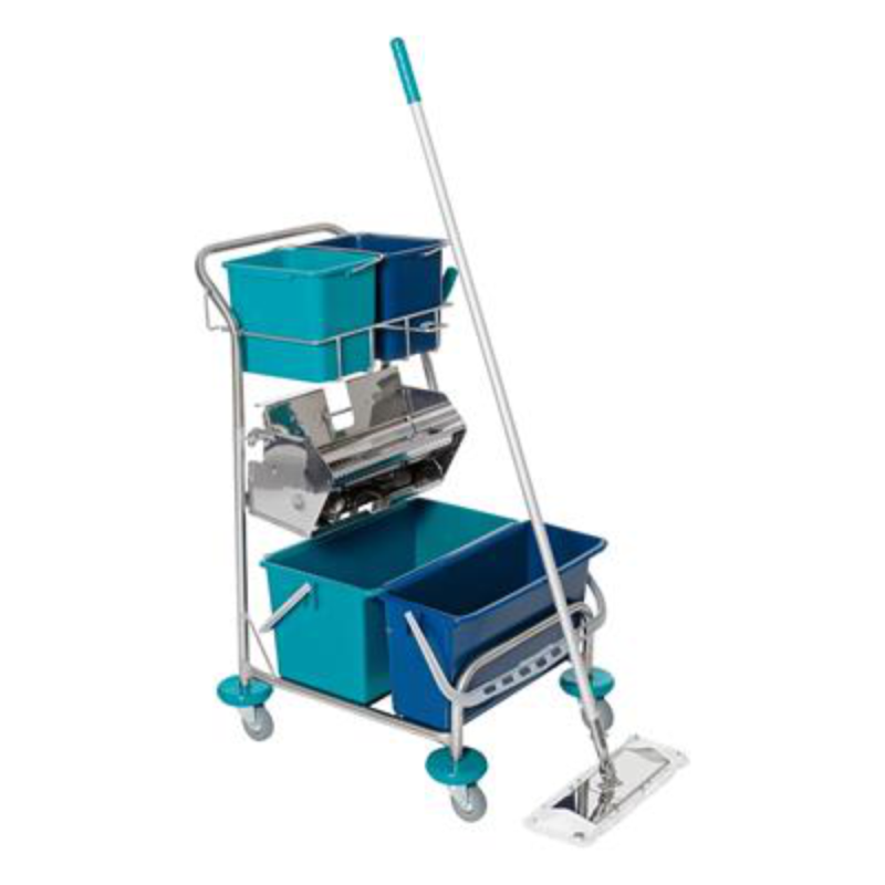 - Very sturdy two-bucket wet-mopping unit for high hygiene standards made of galvanized steel tubing.